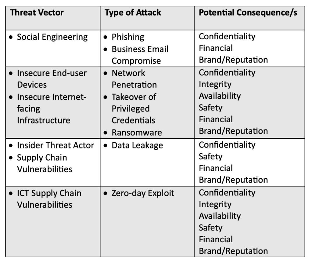 Once the consequences have been considered, identify and catalogue the types of vectors and events that could trigger one or more of these consequences. Then use this in conjunction with the risk management cycle to drive prioritisation and action. The following example illustrates how this approach could be applied to analysing cyber security risks: